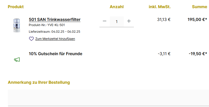 - Sobald Ihr Freund den Link öffnet und einen Standwasserfilter in den Warenkorb legt, erscheint der 10 %-Gutschein automatisch.