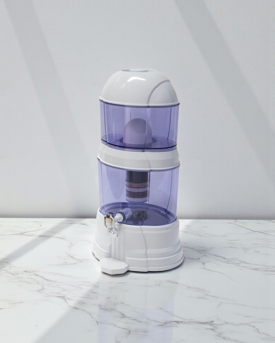 Einfach oben Leitungswasser einfüllen – der natürliche Schwerkraftfilter sorgt Tropfen für Tropfen für klar gefiltertes, wohlschmeckendes Wasser.