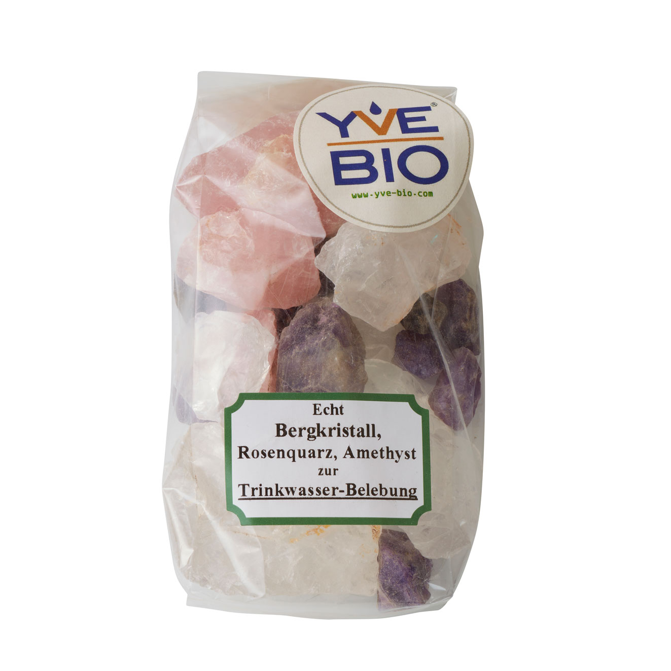 Grâce à ces pierres précieuses d'améthyste, de cristal de roche et de quartz rose, votre eau aura un goût particulièrement harmonieux et doux après une courte période d'exposition. Il suffit de placer ces pierres au fond de votre réservoir d'eau YVE-BIO® ou dans votre carafe d'eau.Votre eau aura ensuite un meilleur goût et sera sensiblement plus vitalisée.